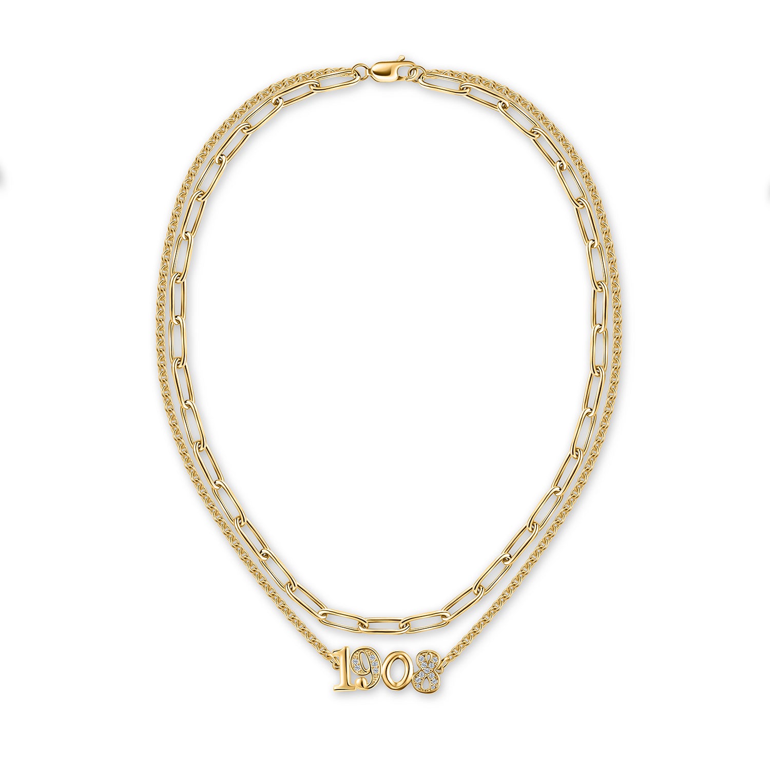 Double the Charm with the 1908 Layered Necklace! ✨ Elevate your style game with this stunning piece that lets you rock two necklaces in one. The 1908 Layered Necklace features a chic paperclip-style top layer chain that perfectly complements the lower link chain, adorned with '1908' emblem. This unique design not only adds a touch of elegance but also showcases your pride in a trendy manner. Ideal for any occasion, this necklace effortlessly combines style and significance, making it a must-have addition to your jewelry collection. Shine on with layered perfection!