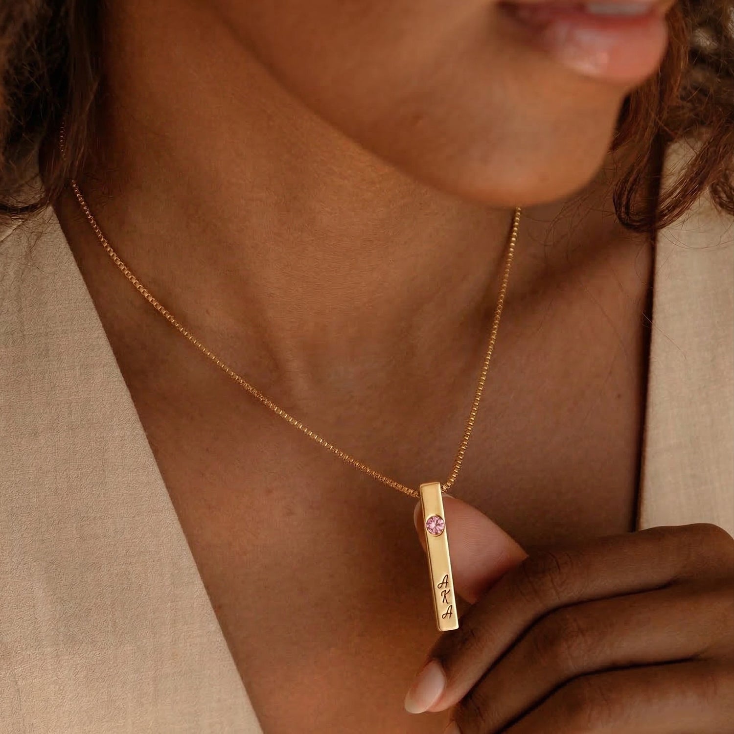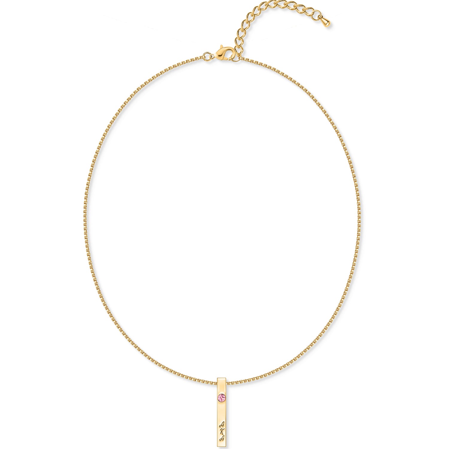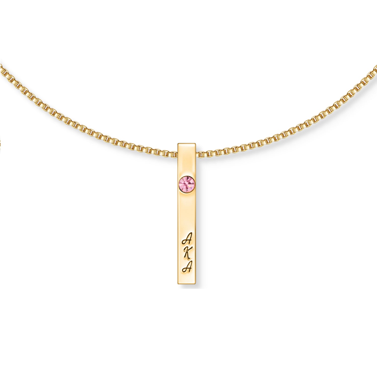 At the top of the pendant, a bold pink crystal adds a radiant touch of femininity and brilliance. Flowing down the front, the AKA letters are engraved vertically, honoring the sisterhood with a refined, minimalist aesthetic. Along the side, the founding year 1908 is engraved with precision — a subtle yet powerful nod to heritage and history.