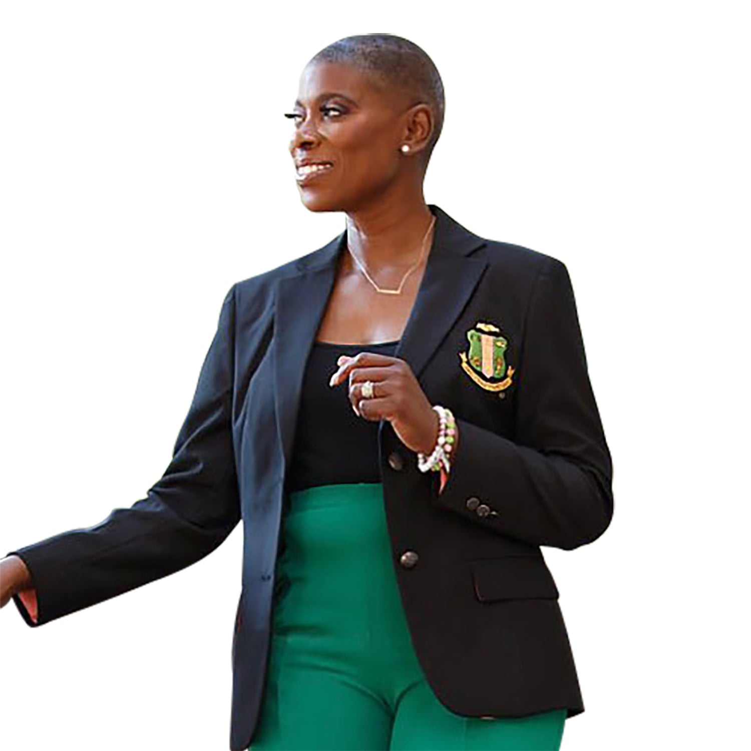 A refined take on timeless sorority style, this black two‑button blazer brings year‑round sophistication to any wardrobe. The smooth pink lining adds a soft, feminine finish, while the custom crest‑designed buttons and AKA Greek‑letter sleeve detail elevate the look with meaningful elegance.